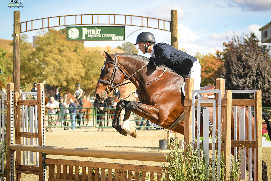 The origin of the hunter class can be traced back to the sport of fox-hunting, where horse and rider galloped over miles of countryside with varying terrain negotiating natural obstacles (fences, hedges, stone walls). Modern hunter classes are designed to test the qualities and attributes of a successful hunt horse and judges the horse’s performance over fences as well as its quality of movement under saddle on the flat. Show hunters should possess good style over the jumps, consistent pace throughout the course, as well as quiet manners. Hunter rounds should appear smooth and effortless to the spectator with the horse and rider working together to make the course flow from one jump to the next.