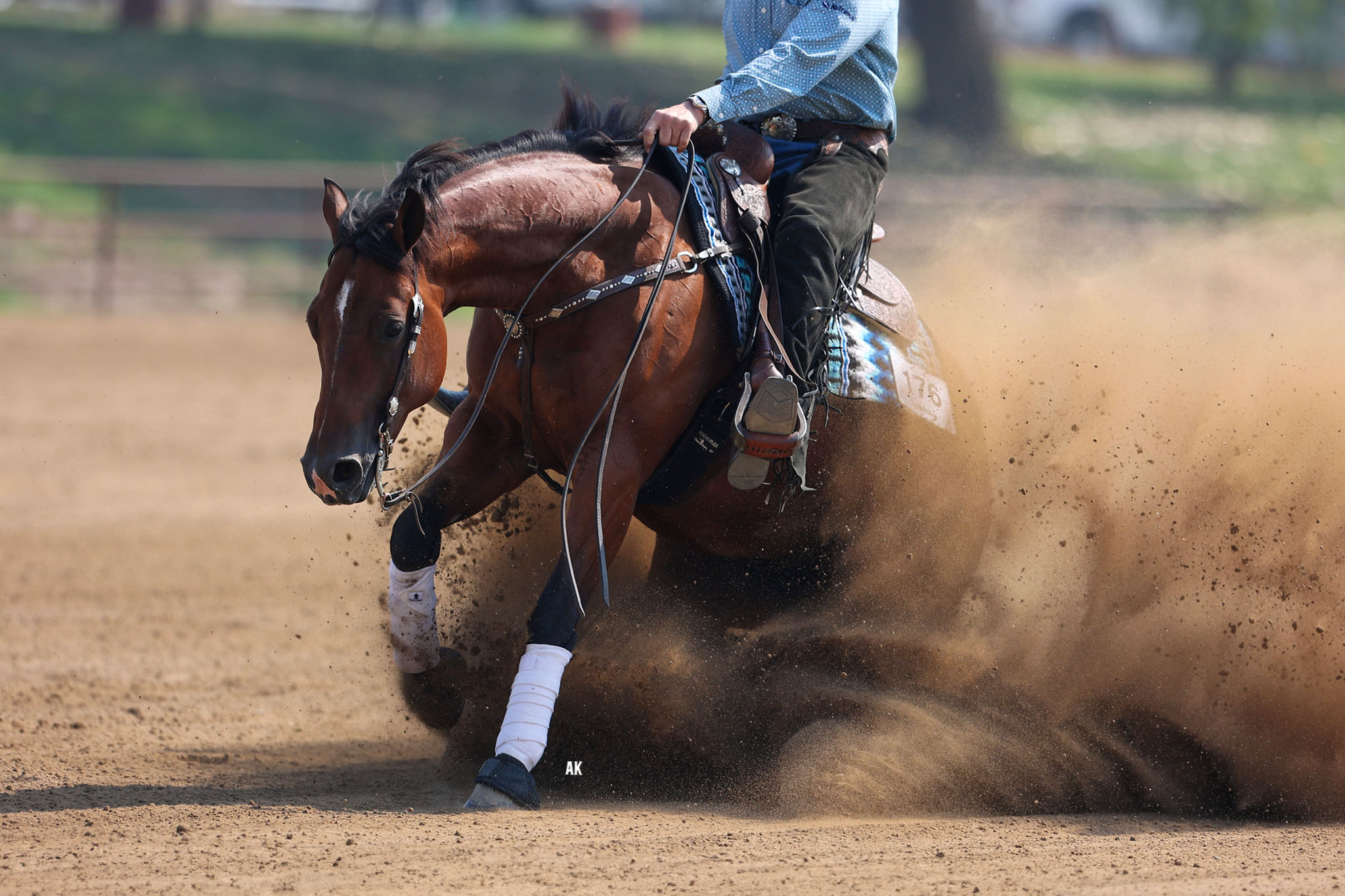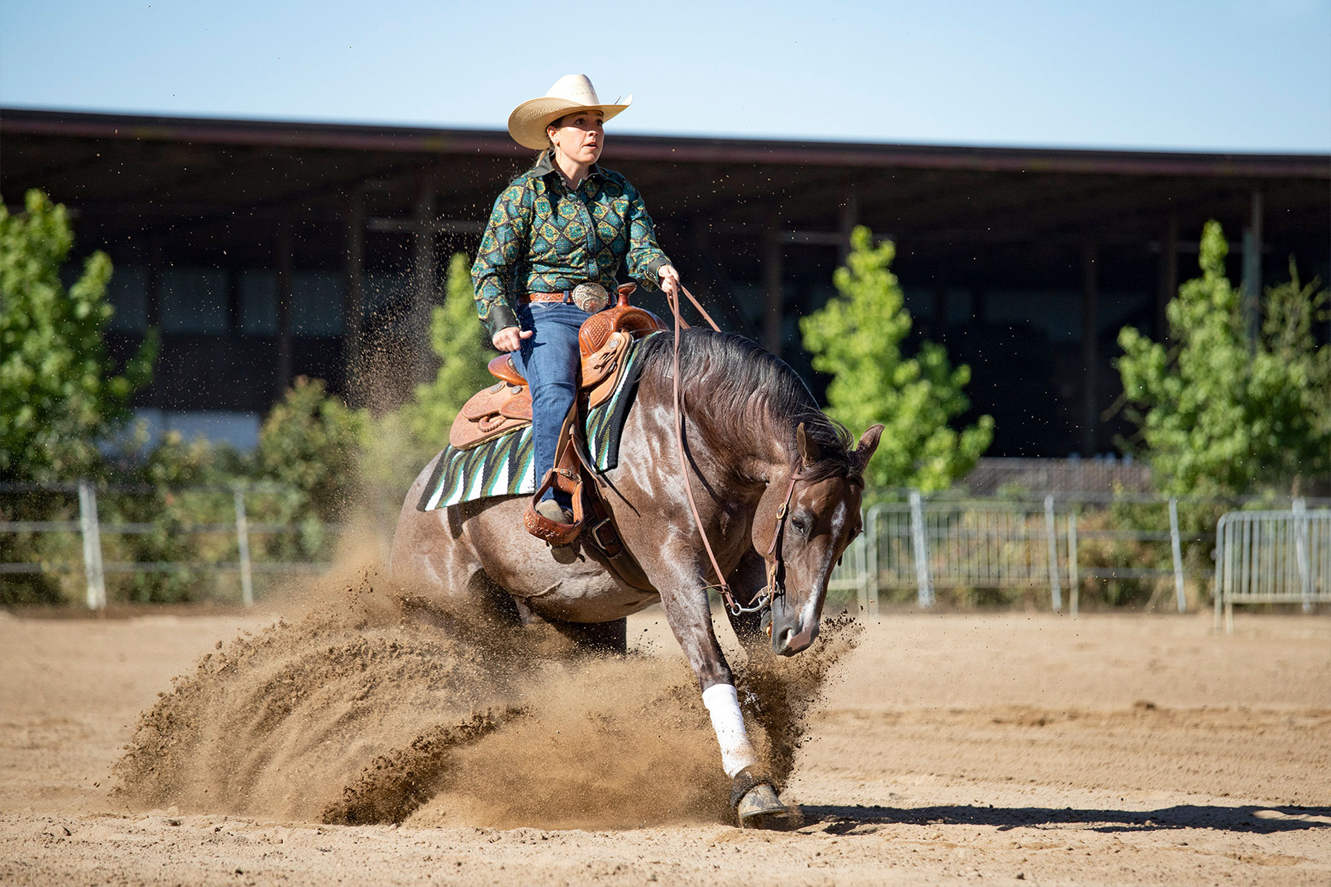Reining is designed to show off the skills and athletic abilities necessary in the working ranch horse, and the movements seen in competition today have become extremely precise and highly refined. Horses exhibit individually—performing approved patterns that include small slow circles, large fast circles, flying lead changes, roll-backs, quick 360-degree spins, and the ever-exciting sliding stops, which have become the hallmark of the reining horse. Each horse automatically begins the pattern with a 70. Judges score each maneuver, adding or deducting up to 1-1/2 points based on the quality of the maneuver. Credit is given for smoothness, finesse, attitude, quickness, and authority.